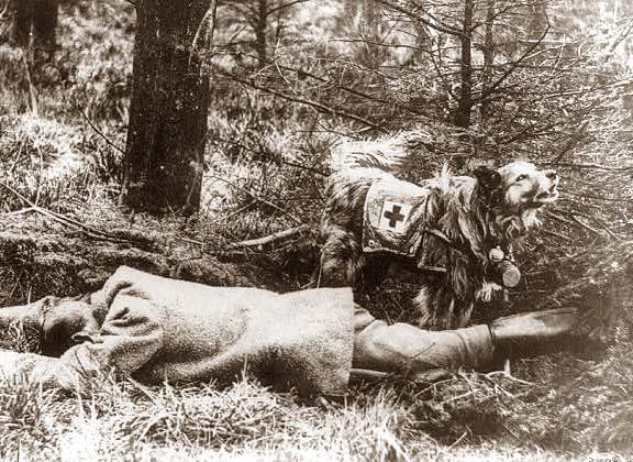 Red Cross dogs were trained to locate the wounded and retrieve a piece of clothing from the soldier – such as a hat or other article. They then delivered that article back to the main group and then lead the medics/stretcher bearers back to the wounded man/men. These animals were also fitted for gas masks so that they could continue their life-saving mission in the worst of conditions.